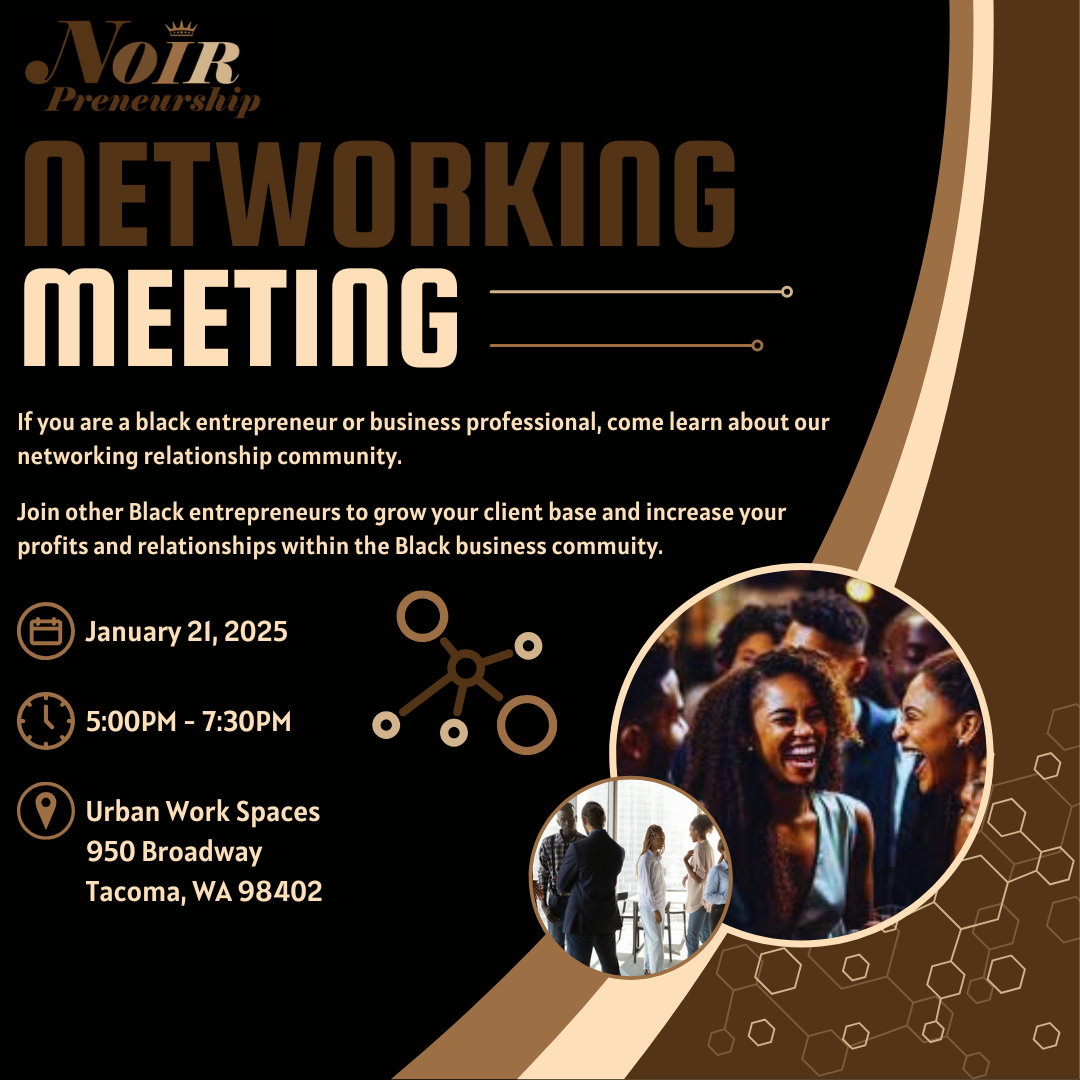 Join us on Tuesday, July 15, 2025, from 5:00 PM – 7:30 PM at our new home, Tacoma Arts Live (ACE), for an empowering evening of connection, strategy, and growth at Noir Preneurship’s next Networking & Training Meeting.